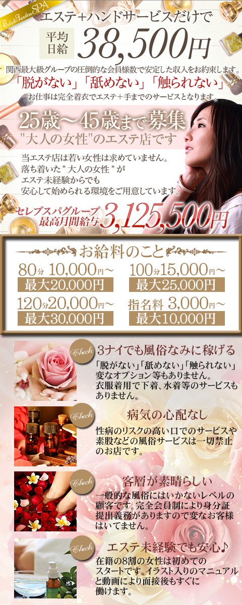 家計のために何か仕事をしようと思っている人妻の方は多いと思います。 ですが、なかなか良い求人が見つからないという方もいるのではないでしょうか。 関西の中でも圧倒的な地位を持つグループであるため、大阪の梅田を中心に神戸などにも展開をしていますので、働く場所も選びやすいのがポイントです。 セレブガーデンスパの求人の特徴としては、性感エステ・マッサージではありますが「脱がない」「舐めない」「触られない」 の3つが揃っていて、それでいて高収入を得られるというものがあります。 セレブガーデンスパの性感エステ・マッサージ求人であれば、服を着用して手を使ってサービスをするだけですから抵抗も少なく高収入を得られるのが魅力となっています。 全身を使って稼ぐとなると最初のうちは良くても段々と辛くなってきてしまいますが、ハンドサービスだけであれば長く続けることができますから、結果的に一般的な風俗店で働くよりも稼ぎやすいといえますよ♪ お問い合わせお待ちしております♪
