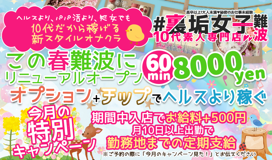 お仕事内容はとーってもソフト☆ 最初はお客さんと同じ部屋に一緒にいるだけから始めましょう! 手コキもしなくてOK♥ お客さまと出会ってから「どんなオプションをオススメするか」「いくらでそのオプションをしてあげるか」ぜ~んぶ女の子が決めちゃえます! オプション料は全額お給料にプラスだから上限なしで稼げますよ♥